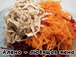 Свеклу, морковь и курицу немного посолить и смешать с оставшейся смесью майонеза и горчицы