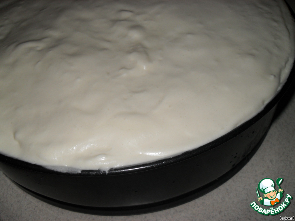 Выпекаем на водяной бане, т.е. в глубокий противень сначала ставим форму с тестом, а затем наливаем горячей воды, чтобы она доходила примерно до середины формы. Во время выпечки духовку открывать нельзя. Бисквит ("Японский чизкейк") сначала сильно поднимается, но затем опадает. -