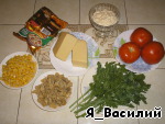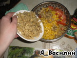 В большой емкости смешиваем сыр, помидоры, кукурузу и грибы.