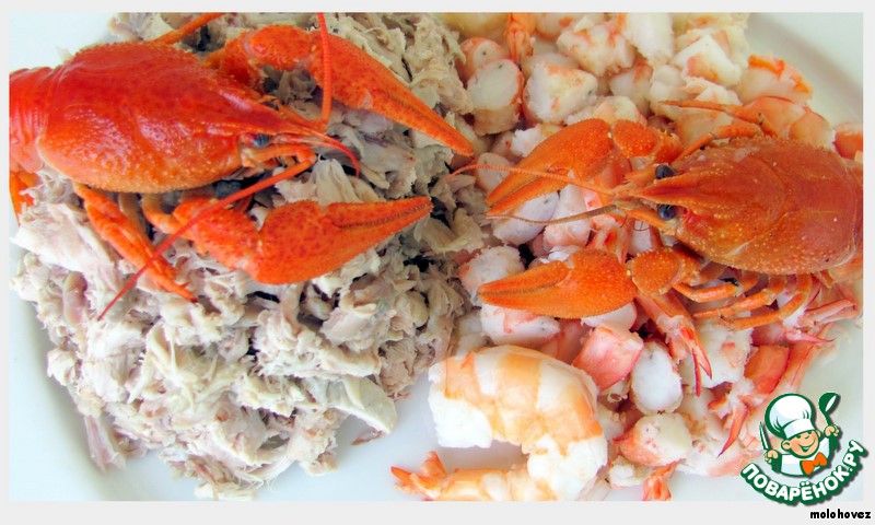 - Вполне можно использовать готовые очищенные креветки, шейки раков, если такие имеются.