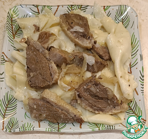 Я тоже так бешбармак делаю! Вот только тесто в магазине беру, оно у нас специально продается - казахстанское! И отвариваю я его в том же бульоне, где и курицу.