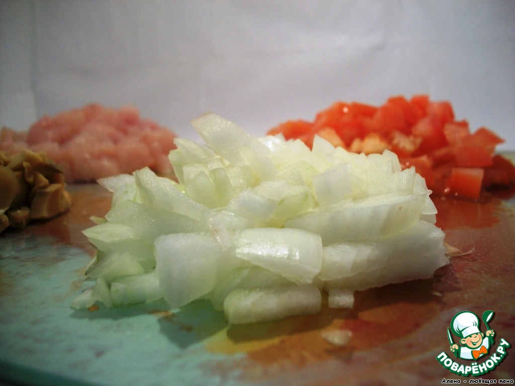 Грибы, лук, курицу и помидор нарезаем на мелкие кубики