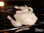 Но сегодня наша птичка должна быть "налегке", поэтому закалываем отверстие, нанизываем на шампур и жарим на гриле в духовке 1 - 1,5ч. (в зависимости от размера курицы) при t180-200 град. Можно жарить просто в духовке, если нет гриля.