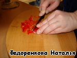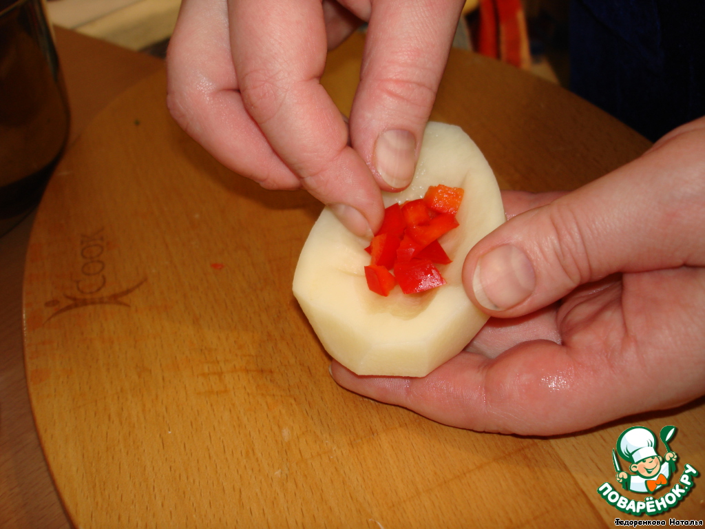 • В серединку картофелины положить нарезанный болгарский перец. В качестве начинки можно также использовать жареный лук с грибами.