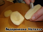• В готовый мясной фарш добавить отварной рис, посолить и поперчить по вкусу. Очищенный картофель разрезать пополам, вырезать серединку для заполнения начинкой