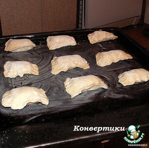 КОНВЕРТЫ. Складываем пополам, защипываем. Защипать надо как следует, чтобы творог не вытек, когда тесто начнет подниматься и выталкивать его. Если все же вытолкало - пока начинка теплая, ее можно пальцем обратно запихнуть :)