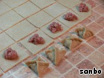 На каждый квадратик выложить немного фарша, все четыре уголка собрать в центре и защипнуть. Получатся маленькие "конвертики".