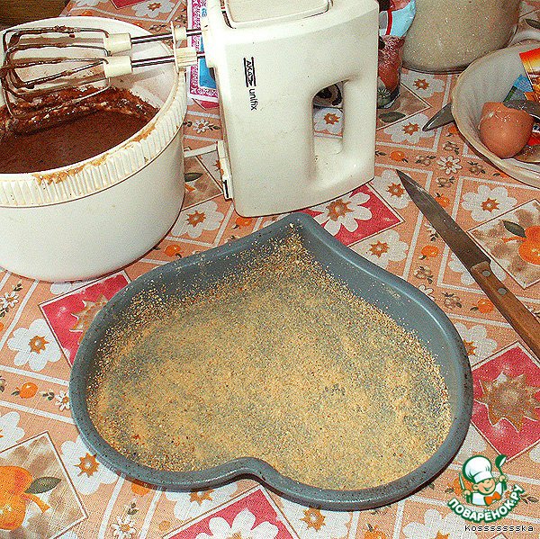 Форму щедро смазываем маслом. Если у вас форма металлическая, кладите на дно бумагу для выпечки. Если силиконовая, то посыпьте масло размолотым печеньем или панировочными сухарями.