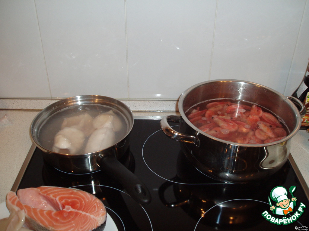 Отвариваем в подсоленной воде кальмаров, так, чтобы они не потеряли форму, и креветки. Буквально 4 -5 минут, иначе они станут жесткими.