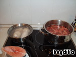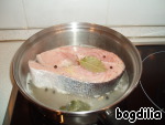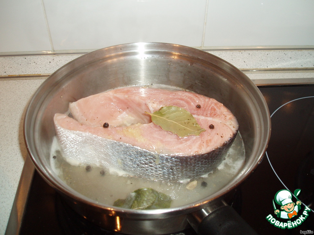 Рыбу тушим в небольшом количестве вина, воды и сока одного лимона в течение 20 - 30 мин. Добавляем соль, перец по вкусу и лавровый лист.