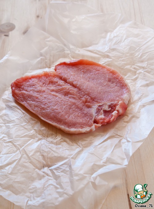 Хорошо отбить два куска свинины. Мне их отбил мясник в мясной лавке. Обильно обсыпать солью и перцем. |