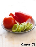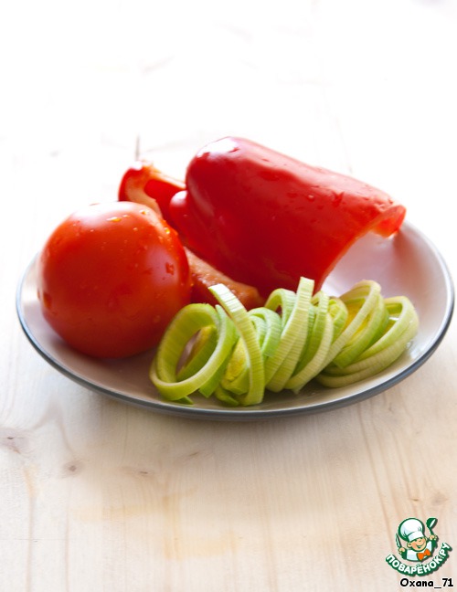 Лук-порей и помидор нарезать тонкими кольцами. Перец - полу кольцами |