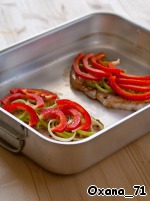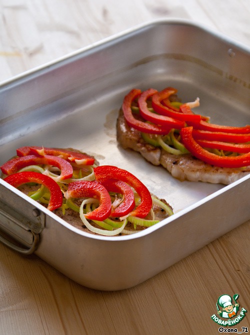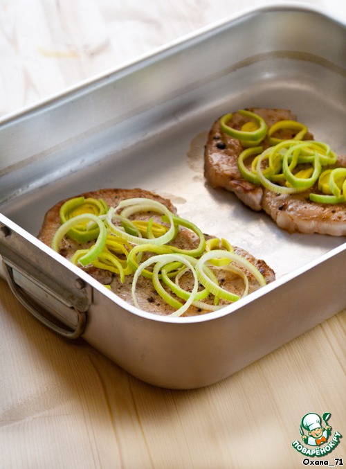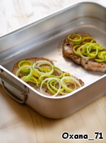 Выложить мясо в жаропрочную форму или на противень. Сверху выложить лук-порей... |