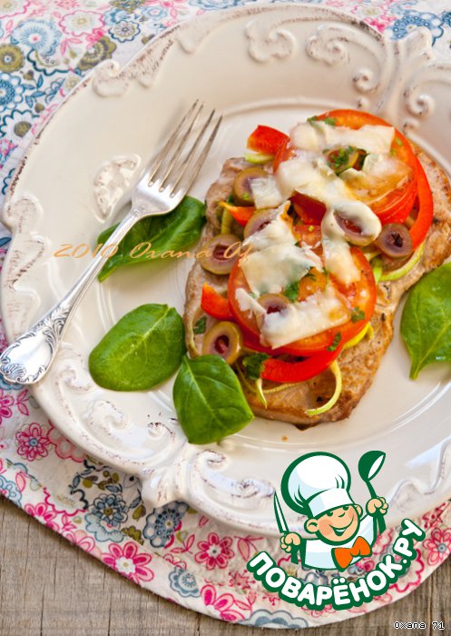 Отличная альтернатива поднадоевшей всем отбивной из свинины. Рецепт этого блюда был размещeн на сайте в 2008 году пользователем Lill под названием "Свинина по-французски" и иллюстрирован мной в рамках акции "Раскраски".