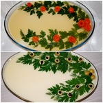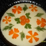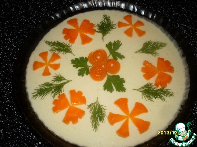 Теперь творчество!!! На чистом белом фоне разложить зелень и украшения из моркови. С чайной ложки осторожно покапать на них в разных местах прозрачным желе и аккуратно отправить в холодильник на 5-10 минут. Это делается для того, чтобы при заливании прозрачным желе, украшения не вплыли и не сдвинулись с места.