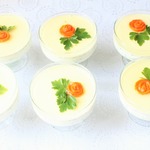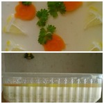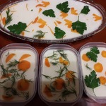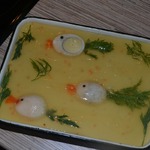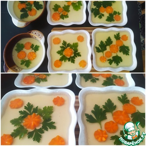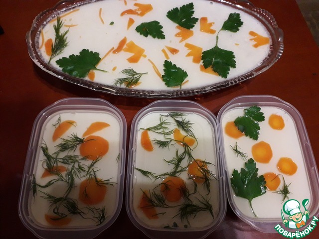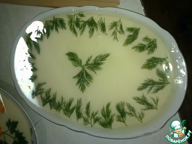 Застывшее желе вынуть из холодильника и аккуратно залить белым желе, которое отлили ранее. Снова убрать в холодильник до полного застывания. Тем временем подогреть отлитый ранее прозрачный бульон с желатином до полного его растворения и охладить полученное прозрачное желе.