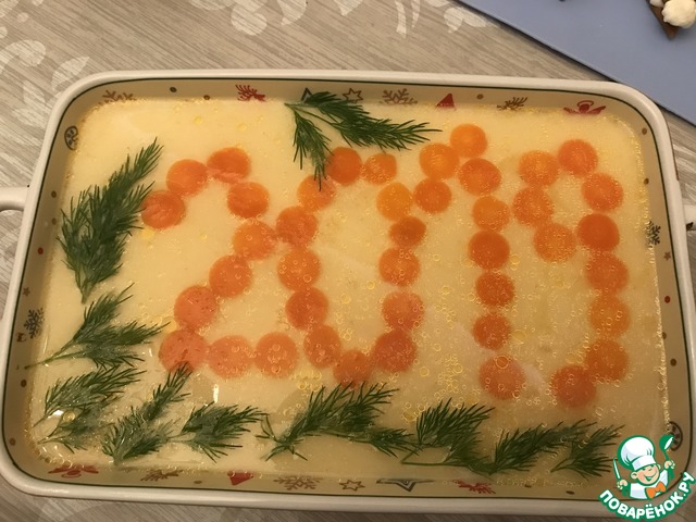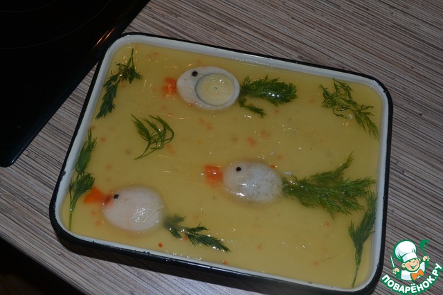 Выложить рыбу с желе в форму (или несколько небольших форм), разровнять и поставить в холодильник, пока она полность не застынет.
