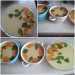 В кастрюлю сложить все отходы, добавить морковь, нарезанную на кусочки, лук, нарезанный на четвертинки, сельдерей и коренья, если они есть, и стебли от петрушки (зелень пойдет на украшение). Залить холодной водой ( примерно 1500-1700 мл). Довести до кипения и варить на очень маленьком огне, чтобы едва кипело, один час.