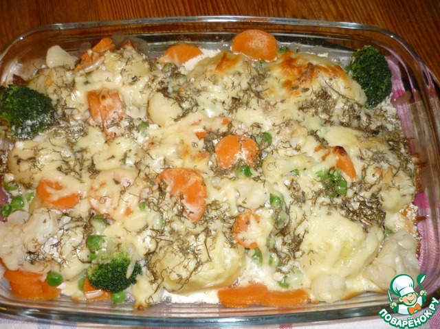 Замороженные овощи, горошек насыпала сверху рыбы и картофеля.
