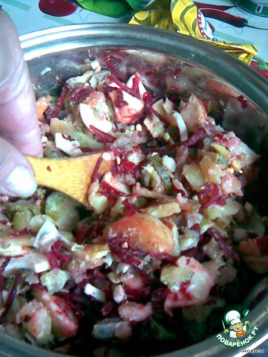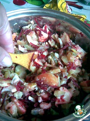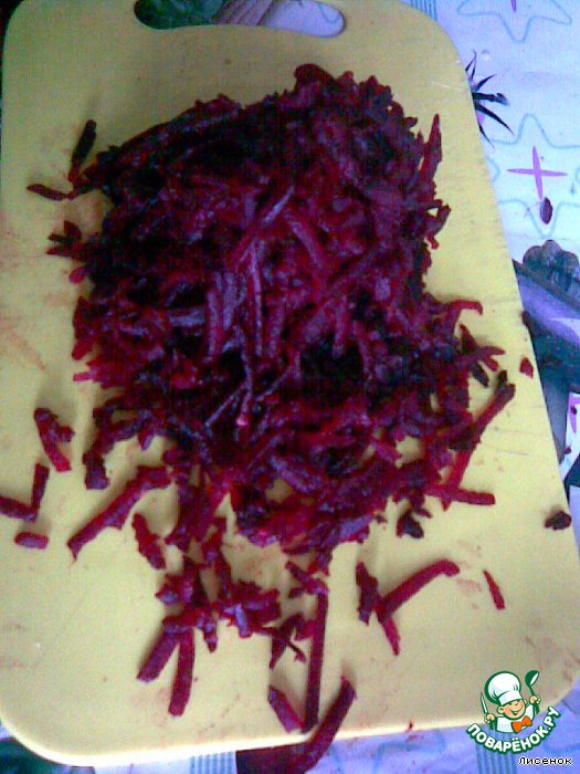 Oтваренную свеклу трем на крупную терку и лук полукольцами(забыла сфоткать).