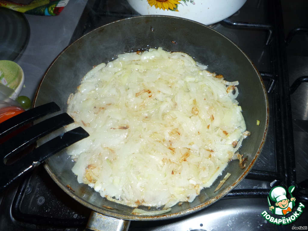 Лука в этом салате должно быть достаточно много, поэтому берем 3 крупных луковицы. Режем лук полукольцами и обжариваем до золотистого цвета на подсолнечном масле.