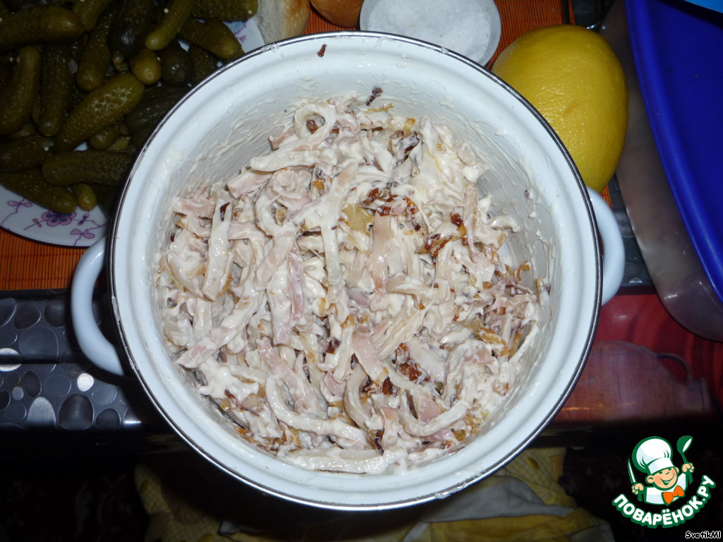 Далее смешиваем лук с кальмарами и заправляем майонезом и все - салат готов! Приятного аппетита! )))