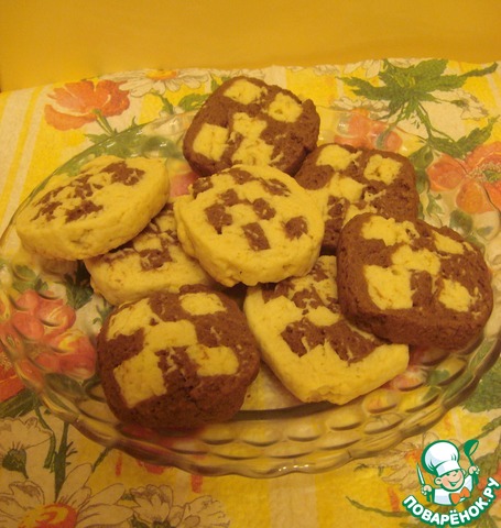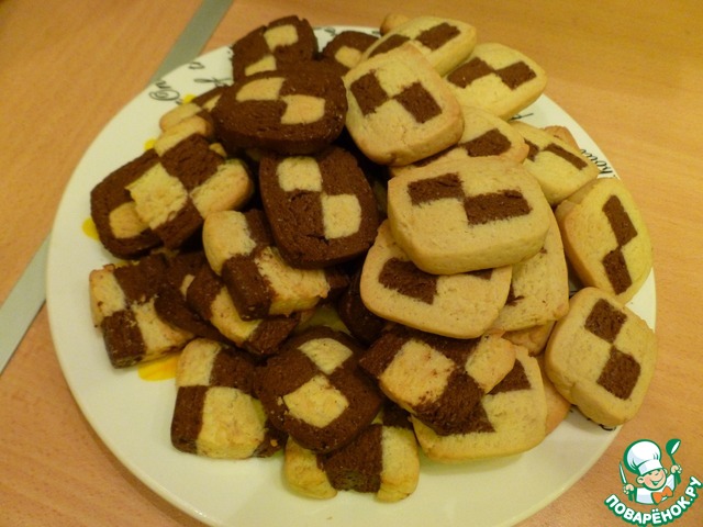 Застелить пергаментом противень, нарезать печенье пластинками, толщиной 7 мм и выпекать 15 мин до готовности, но не давая зарумяниться, иначе пропадёт шахматный эффект.