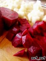 Картофель, грушу и свёклу почистить, нарезать небольшими кубиками