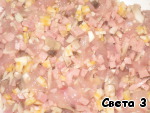 Мелко нарезаем куриное филе, грибы, ветчину и сыр, немного подсаливаем.