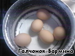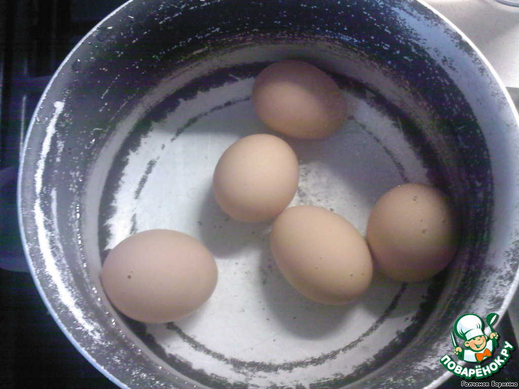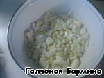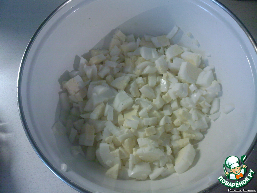 • После того как сварились яйца, очистить их и нарезать кубиками. Добавить к луку.