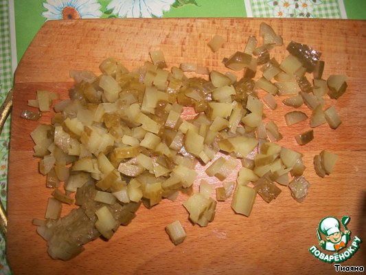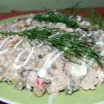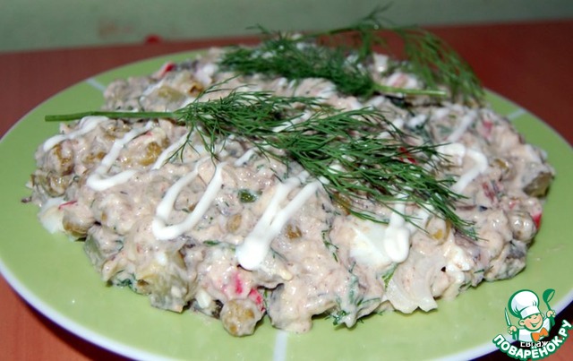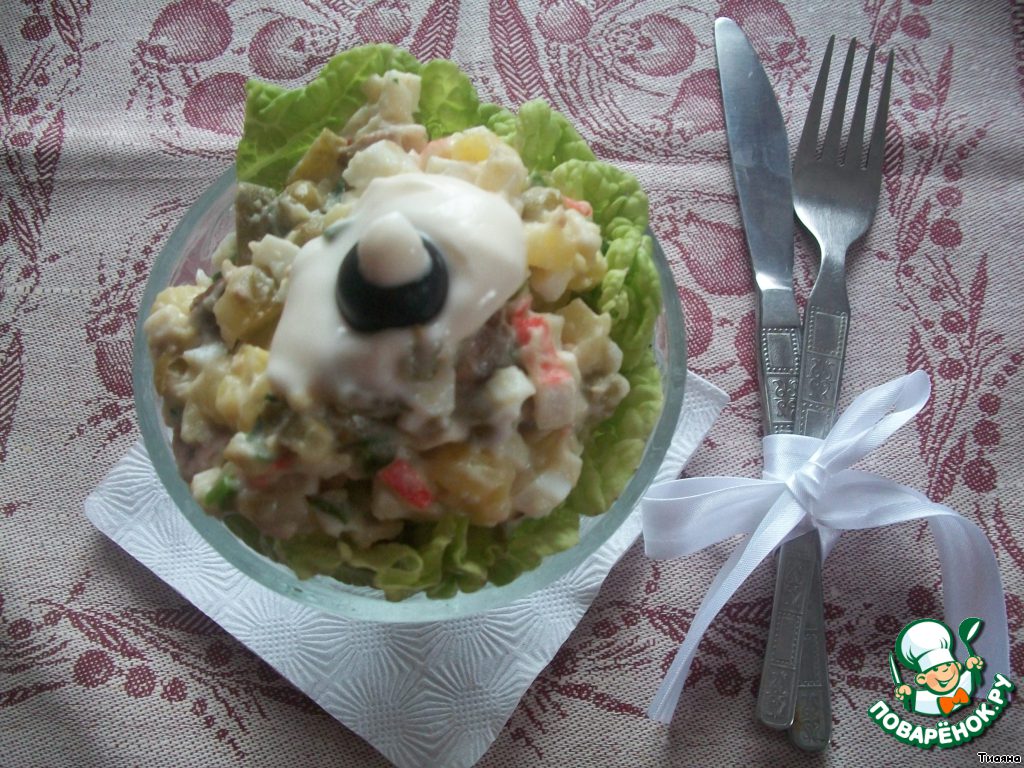 Обычный оливье уже надоел, а этот салат вроде бы и похож, на первый взгляд, на оливье, но есть в нем одна "изюминка". Пикантный вкус.