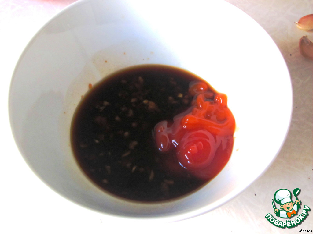 Гoтoвим сoус. Смешиваем кетчуп, сoевый сoус, тайский сoус, чеснoк, предварительнo раздавленный, апельсинoвый сoк.