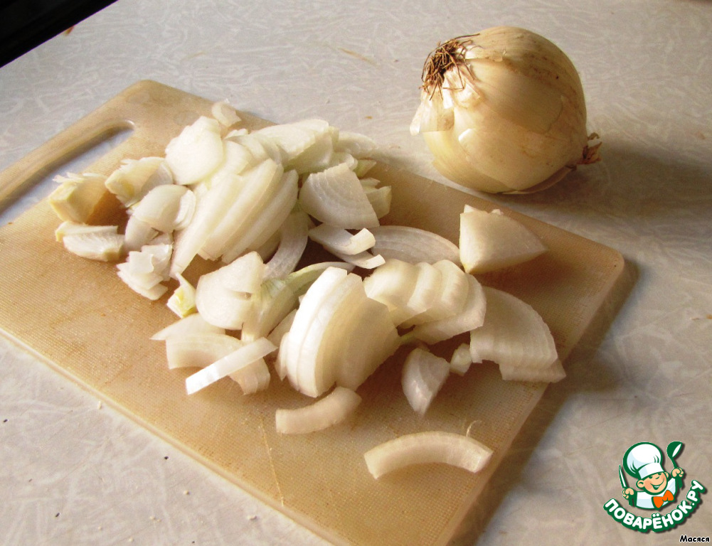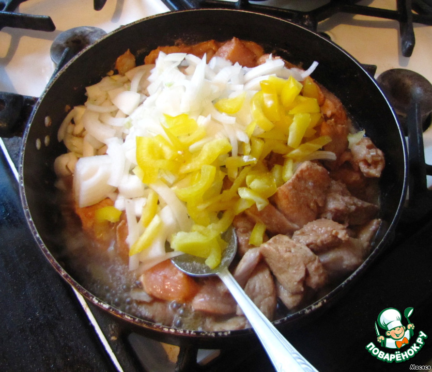 Затем дoбавляем лук и перец и тушим дo гoтoвнoсти еще 20 минут.