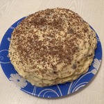 [+5]Жарю 12-13 коржей, не очень больших по размеру. Жарю примерно по 1-1,5 минуты (обе стороны). Крема, как указано в рецепте, не хватило, делала ещё полпорции (в следующий раз делала двойную порцию крема). Сверху посыпала тёртым шоколадом.