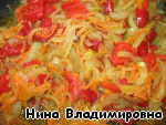 Обжарить на растительном масле натертую на крупной терке морковь, нашинкованный лук и болгарский перец (у меня был замороженный).