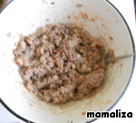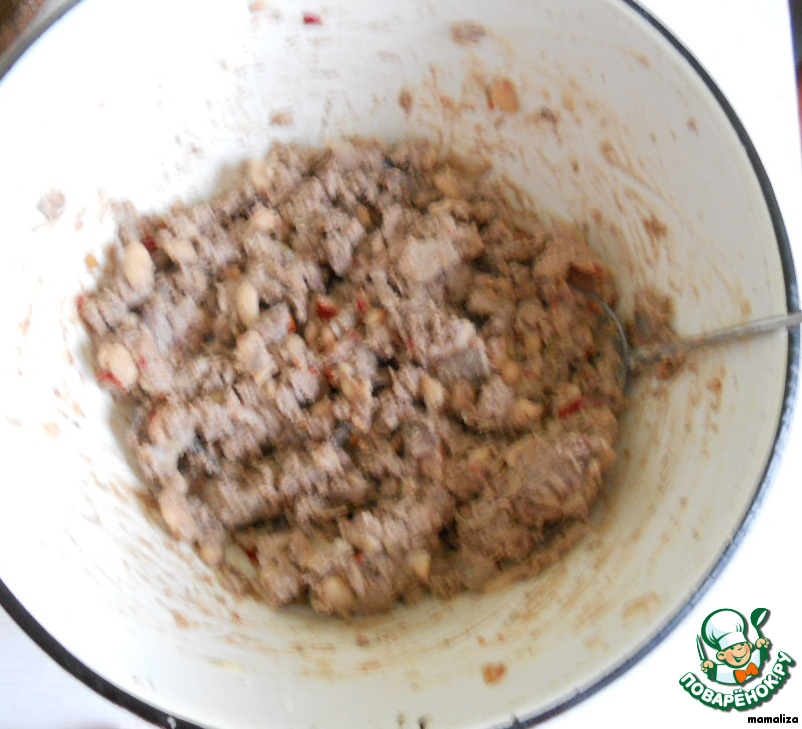 Печень порубить ножом на небольшие кусочки. Соединить печень и фасоль, посолить, поперчить.