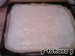 Hа противень укладываем один коржик-блин, на блин выкладываем половину начинки.