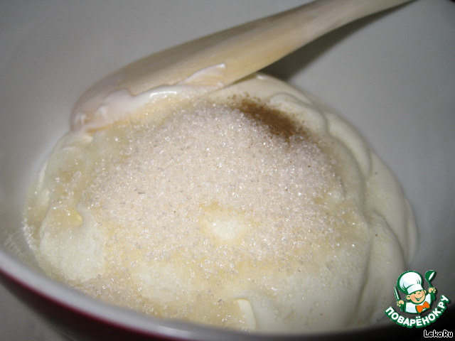 • Тем временем сделаем крем. В сметану положить сахар, чуть корицы. И размешать.