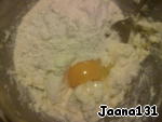 Добавить муку, соду (разрыхлитель) и яйцо. Замесить тесто. Если прилипает сильно к рукам, то добавить еще муки.