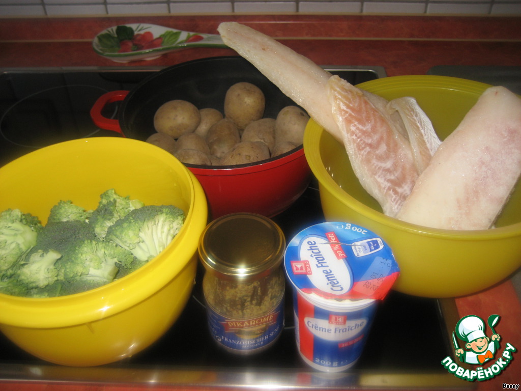 Сметану и горчицу размешать, посолить, поперчить. Рыбу, картофель и брокколи перемешать и переложить в форму для запекания, смазанную маслом. Сверху распределить соус, всё это посыпать сыром.