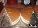 500 мл сливок взбить в густую пену с 2 ст. ложками сахарной пудры и загустителем для сливок. Обмазать торт сливками. Кокосовую стружку поджарить до золотисто-коричневого цвета и обсыпать ей края торта. Украшайте по своему желанию! Приятного аппетита!