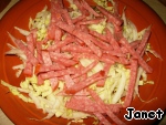 - Колбаса (сервелат или салями, пять кружочков) — 50 г