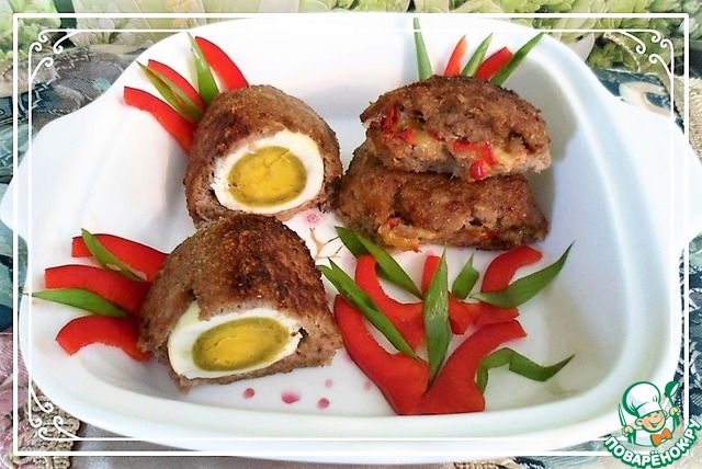 Из мясного фарша на ладони делаем заготовки, которые заполняем сырно-перцовым фаршем и целыми варёными яйцами, формуем в зразы.