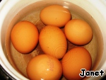 Яйца отварить в течение 12 минут, залить холодной водой.