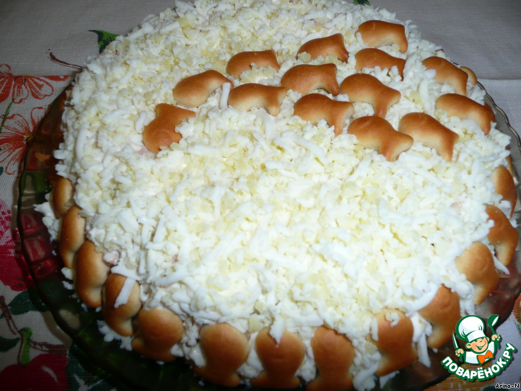 Я украсила салат "рыбками" и постаила в холодильник часа на 3-4 для пропитки слоев!