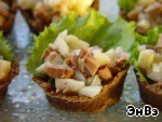 Процесса приготовления корзиночек испугалась, поэтому получились просто бутербродики на черном хлебе. Салат понравился- Вкусно!!!