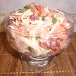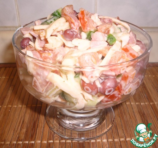 Добавить фасоль (жидкость слить), красный молотый перец и чеснок, измельчив чеснокодавилкой. Салат заправить майонезом, украсить и подавать на стол!