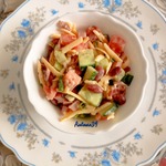 Помидоры, огурец, ветчину нарезать мелкими кубиками, сыр натереть на терке.