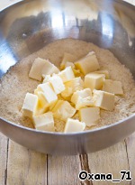 Добавить 60 г холодного сливочного масла, нарезанного на кубики. Растереть всё пальцами в крошку. Поставить в холодильник.