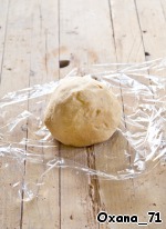 Добавить очень холодную воду и замесить однородное тесто. Скатать его в шар, завернуть в пищевую плёнку и отправить в холодильник на 2 часа.